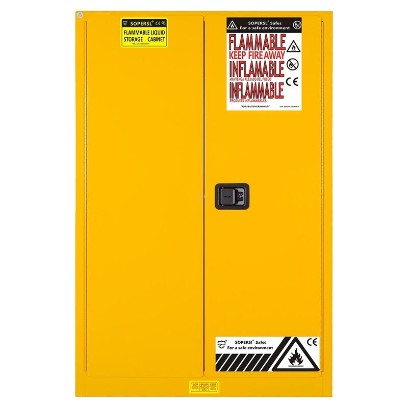Das SUPER 45-Gallon-Flammbare Sicherheitsschrank (170L Kapazität) ist für die konforme Lagerung von brennbaren Flüssigkeiten der Klassen I, II und III ausgelegt.38 mm isolierender Luftraum, zwei 2-Zoll-Flash-Arrestor Lüftungen, und eine 2-Zoll-Vergieß-Einschränkung Sumpf, erfüllt es NFPA 30 und OSHA 1910.106 Standards.